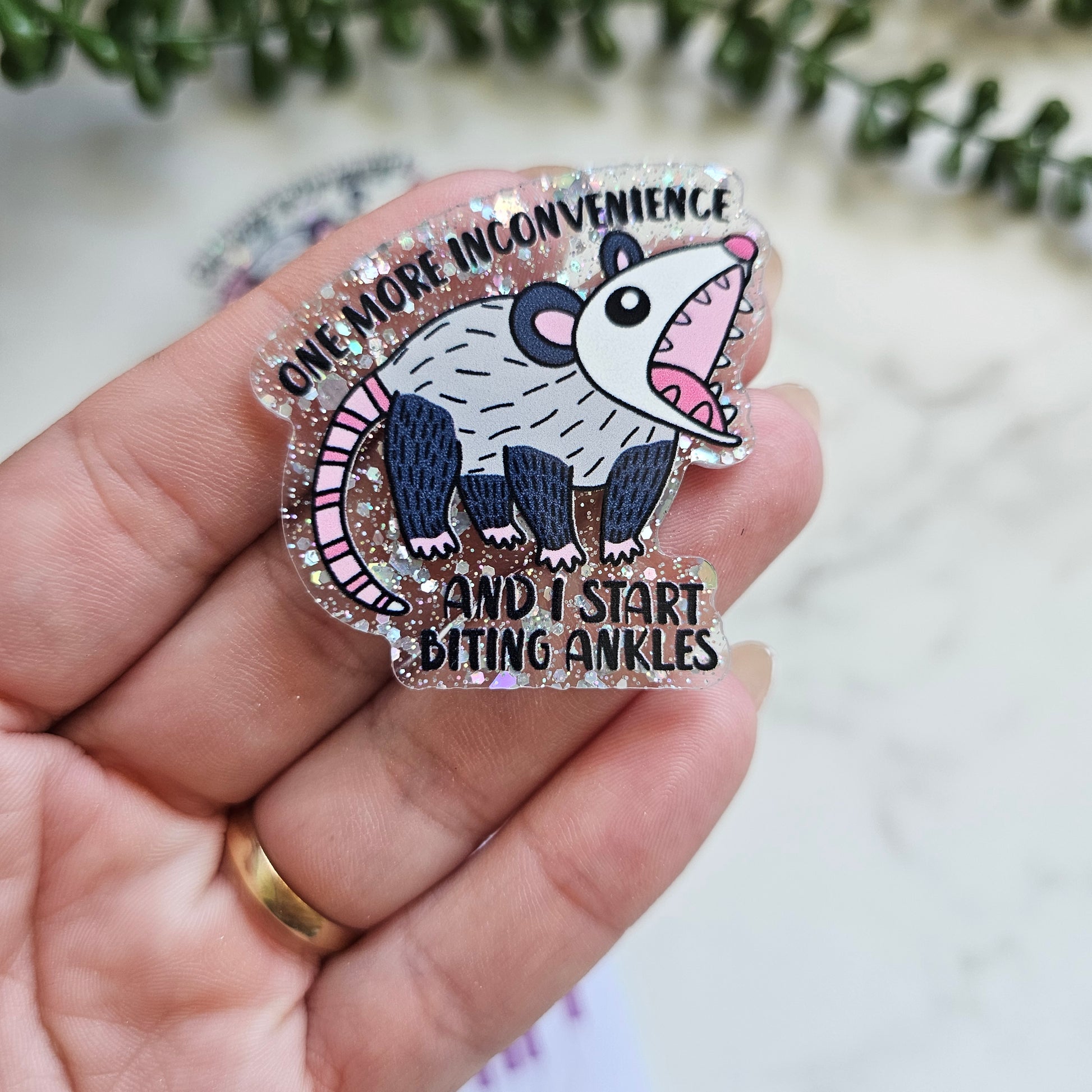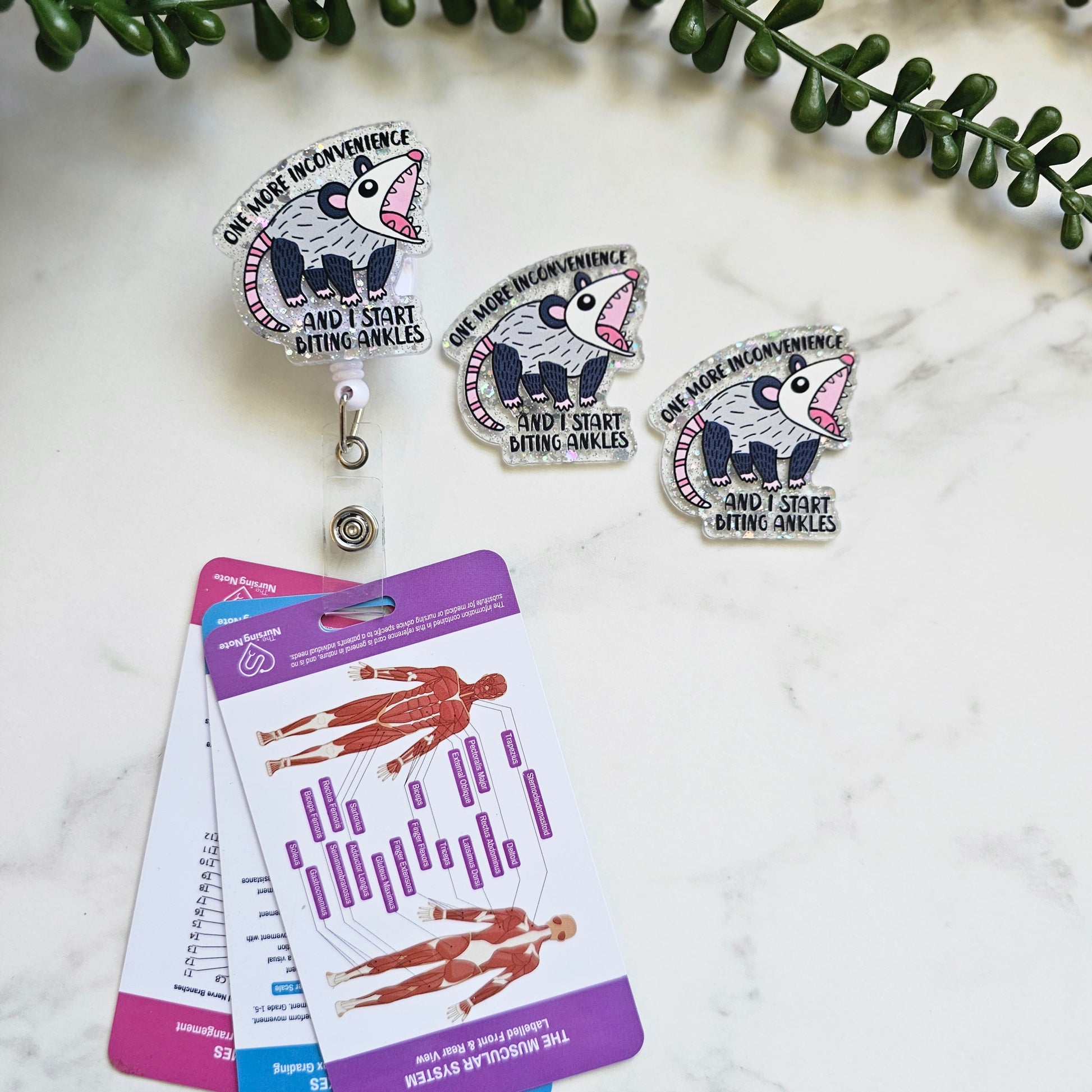 This badge reel is made from high-quality acrylic and features a playful opossum design with the phrase “One more inconvenience and I start biting ankles.” It’s built to be durable, lightweight, and long-lasting, making it perfect for daily use. The reel comes in two attachment options, so you can choose the style that works best for your needs. Keep your ID secure and easily accessible while adding a touch of humor to your uniform or workspace.